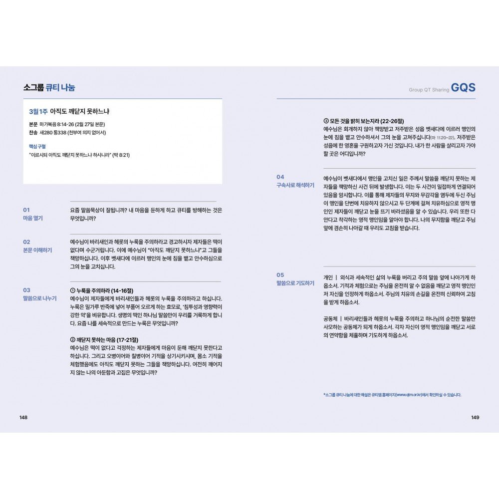 To foster deeper communal meditation, QTin includes a Group QT Sharing (GQS) section. Weekly leader guides are also available on the QTM website (qtm.or.kr).