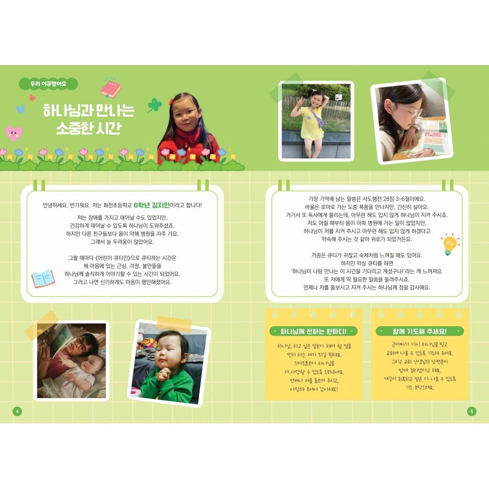 큐티 훈련을 받은 주일학교 어린이와 선생님 60여 명의 보석 간증이 매일 실려 있어 큐티를 어려워하는 친구들에게 큰 도움을 줍니다.
