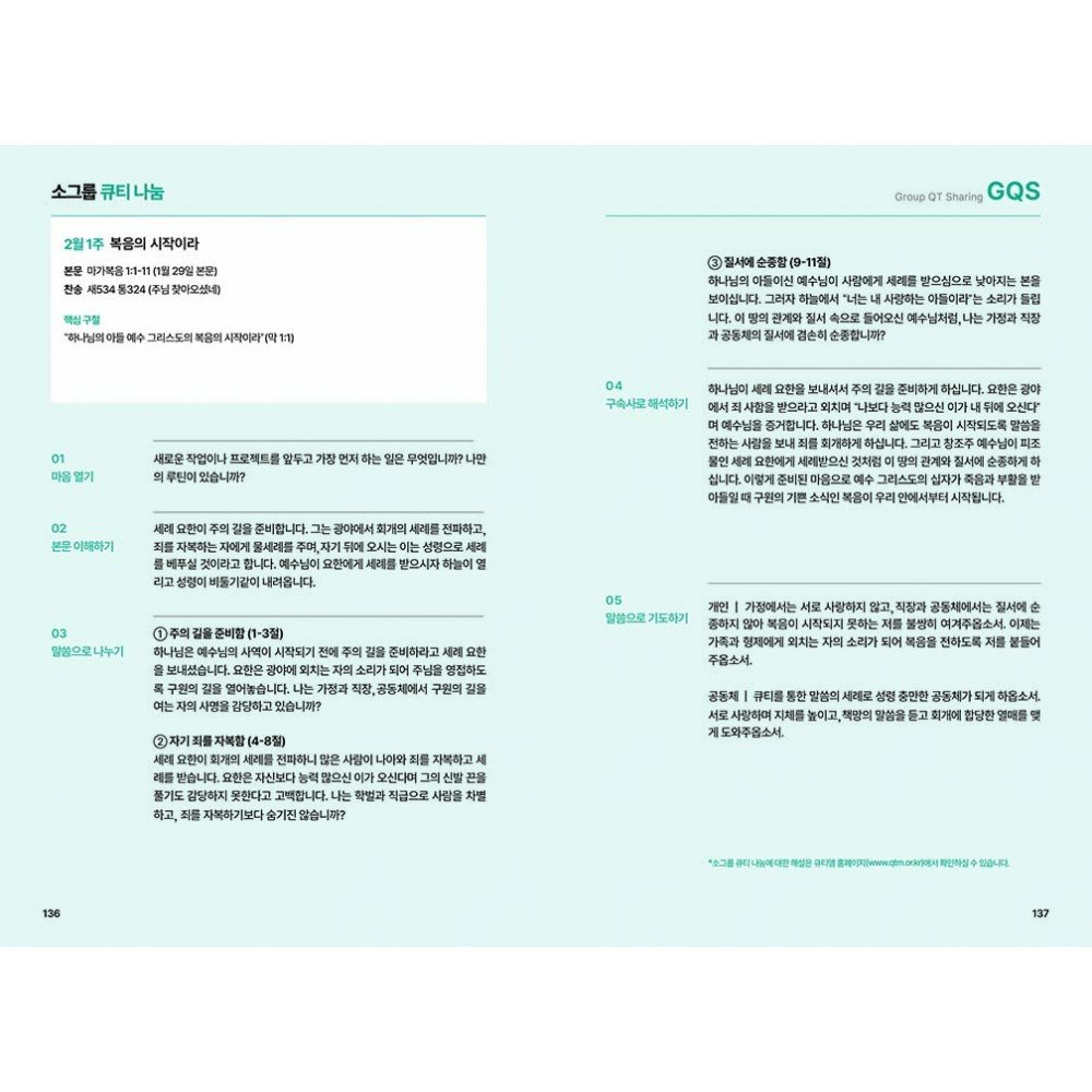 보다 깊이 있는 공동체 큐티 나눔을 위한 소그룹 큐티 나눔(Group QT Sharing)이 포함되어 있습니다.