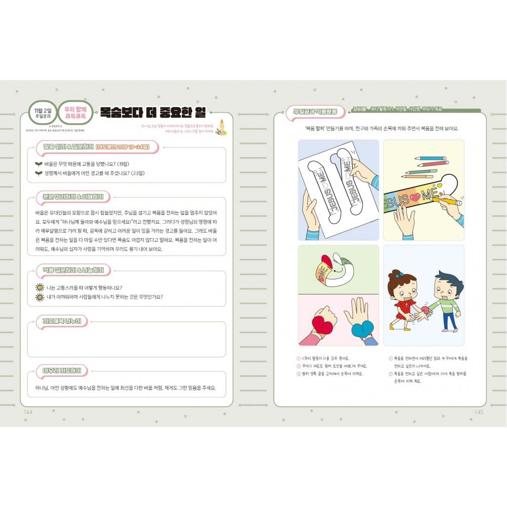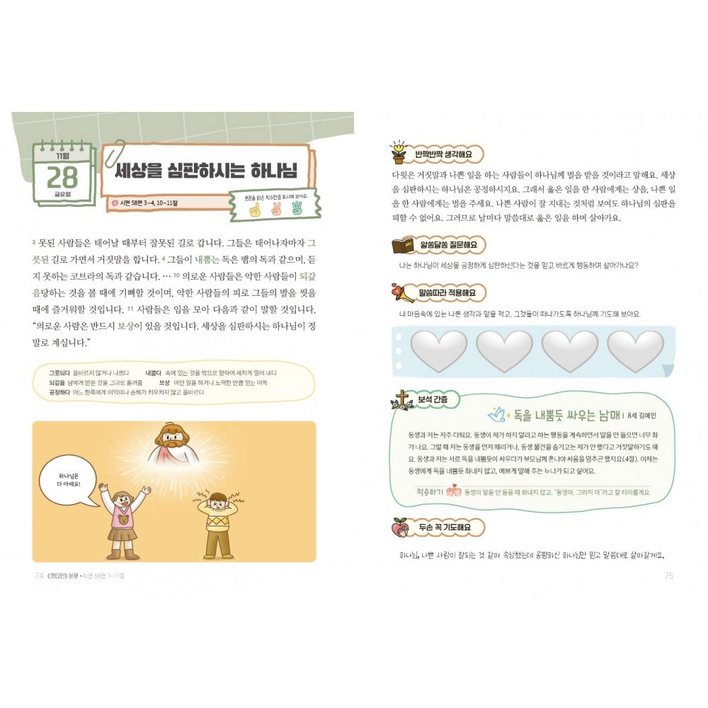 “저는 5살 때 엄마, 아빠와 큐티를 시작했어요. 어른들이 보는 성경책은 너무 두껍고 어렵다는 생각이 들었어요. 하지만 《어린이 큐티인》으로 큐티하며 매일 말씀을 보고, 특히 적용 활동으로 재미있게 큐티 할 수 있어서 좋았어요. 이렇게 큐티를 하면 하나님 말씀을 매일 읽고 배울 수 있어요. 그걸로 끝나는 것이 아니라, 말씀을 나의 생활 속에서 적용하며 지킬 수 있지요!” (9세 이강준 어린이)