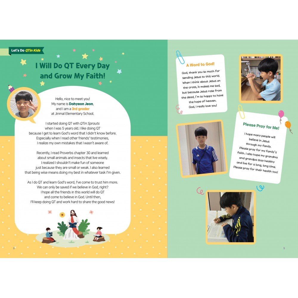 저는 초등학교 3학년 때 《어린이 큐티인》으로 큐티를 처음 시작했어요. 속상하거나 기분이 안 좋을 때 말씀을 보면 제 상황이 이해되면서 기분이 다시 풀려요. 또 성경책으로 말씀을 보면 가끔 내용이 이해가 안 될 때가 있어요. 그럴 때 큐티하면 이해도 잘 되고 말씀도 눈에 쏙쏙 들어와요. … 큐티를 하면 제 모습을 돌아볼 수 있다는 게 좋아요. 평소에 잘못이라고 생각하지 않았던 일도 큐티를 통해 제 죄였음을 깨닫고 회개하게 되거든요. 제 모습을 돌아보며 가족과 친구들에게 더 잘하려고 노력하고 있어요!” (초등학교 6학년 김승혜 어린이)