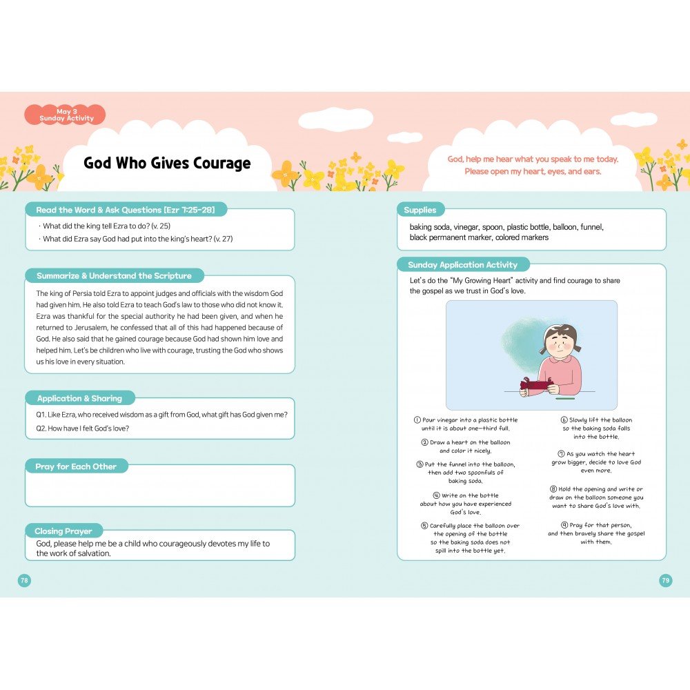 성경 속 중심인물, 사물과 관련된 <페이퍼 토이>를 실어 말씀을 시각적으로 기억하게 합니다. 큐티한 날에 붙일 수 있도록 <붙임 딱지>를 제공해 아이들이 큐티에 흥미를 갖도록 돕습니다.