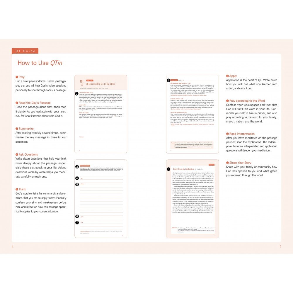 To foster deeper communal meditation, QTin includes a Group QT Sharing (GQS) section. Weekly leader guides are also available on the QTM website (qtm.or.kr).